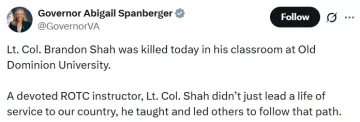 Virginia lawmakers, including Virginia Governor, Abigail Spanberger, have reacted to the demise of Lt. Col. Brandon Shah and Old Dominion University. She took to X account and posted a heartfelt note expressing her sadness over the incident and the passing of the young armyman. Her post could be read as: